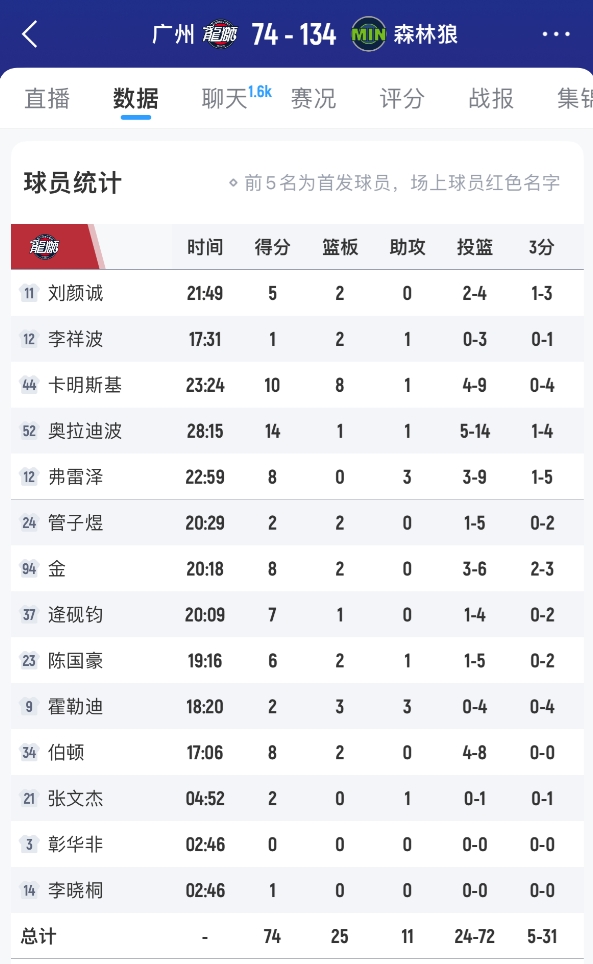 10月14日訊 NBA季前賽,廣州74-134不敵二陣森林狼。全場廣州凈負60分,為其今年三場NBA季前賽輸球最大分差。