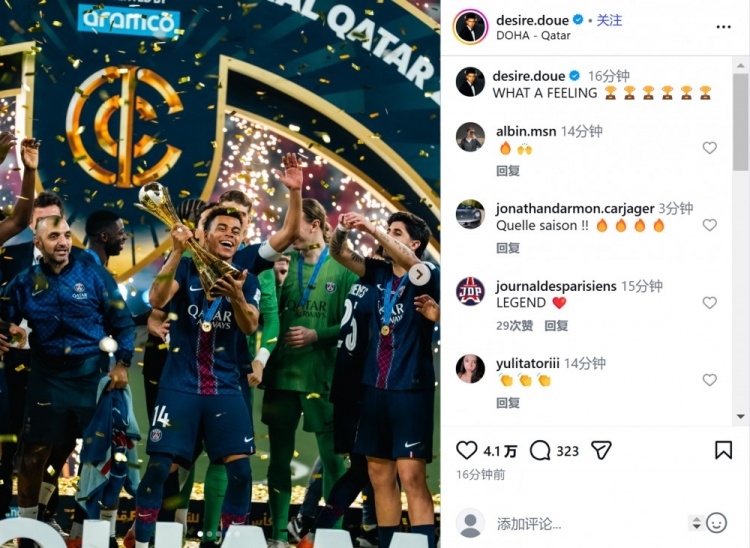 在社交媒體上,巴黎圣日耳曼邊鋒杜埃曬出捧杯照進(jìn)行慶祝,他寫道:多么美妙的感覺!