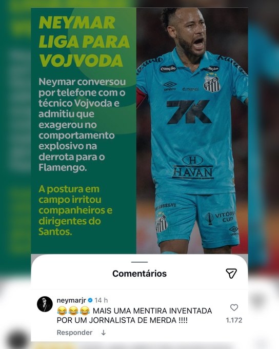 本輪巴甲聯(lián)賽結(jié)束后,有媒體報(bào)道稱內(nèi)馬爾曾主動(dòng)聯(lián)系主帥沃伊沃達(dá),并承認(rèn)在輸給弗拉門戈的比賽中自己的過激行為確實(shí)過分。對(duì)此,內(nèi)馬爾在ge新聞網(wǎng)Instagram推文評(píng)論區(qū)直接回應(yīng):“這又是某個(gè)垃圾記者編造的謊言?!?/p>