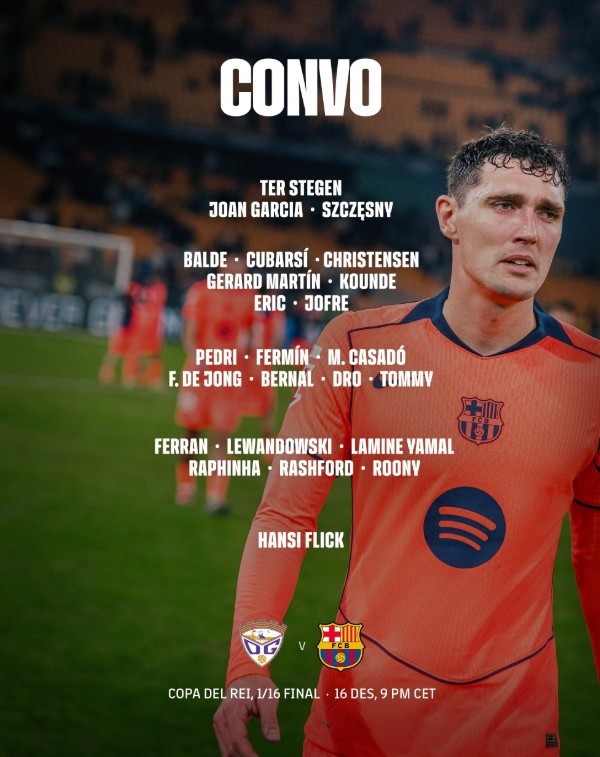 12月16日訊 北京時間12月17日4點(diǎn),國王杯1/16決賽,巴薩客戰(zhàn)CD瓜達(dá)拉哈拉,巴薩官方賽前公布本場比賽名單。