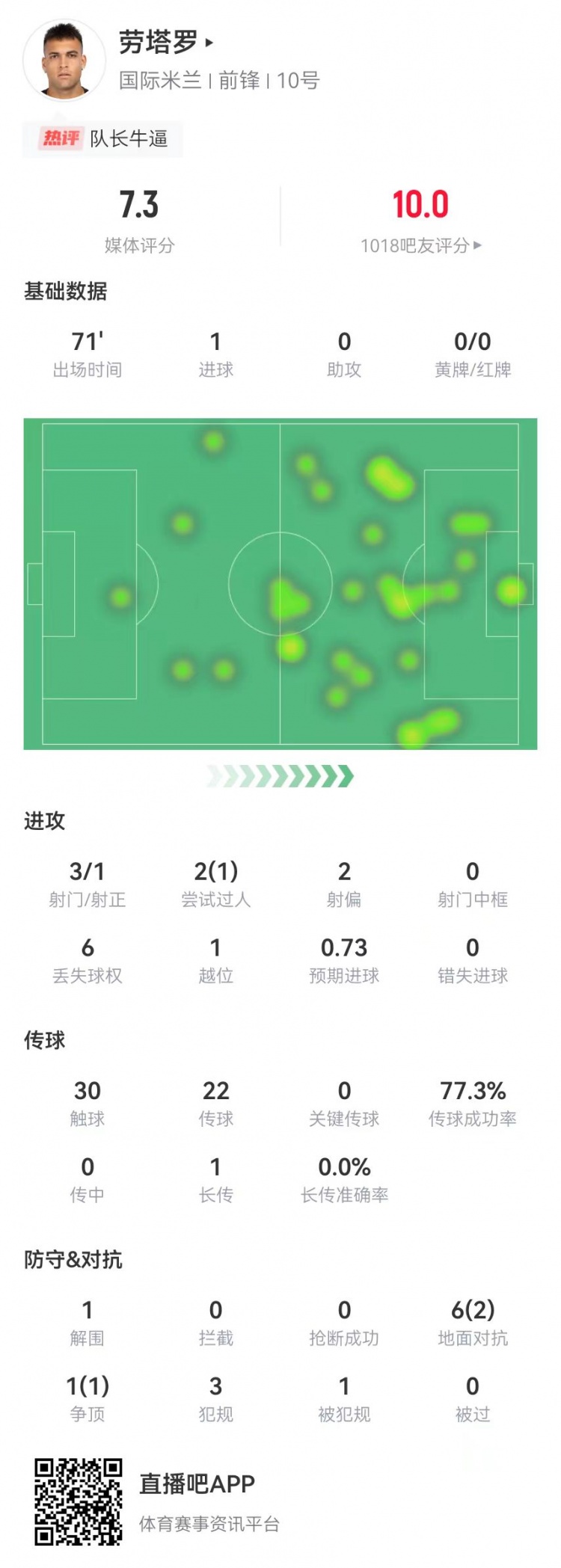 11月10日訊 國米在本輪意甲焦點戰(zhàn)2-0力克拉齊奧,勞塔羅本場數(shù)據(jù)如下: