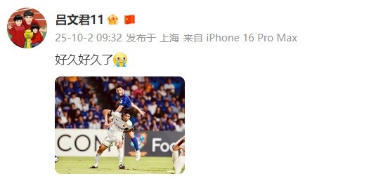 本場比賽海港老將呂文君在第64分鐘替補登場。他賽后更新了個人社媒,曬出本場比賽照并寫道:“好久好久了。”